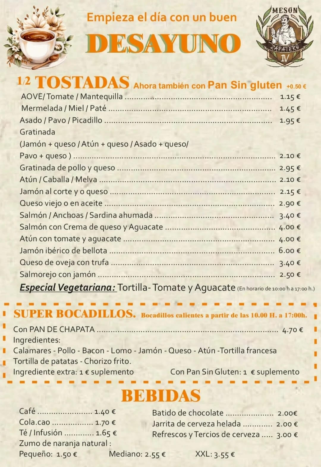 Desayunos que despiertan los sentidosEn Mesón Zapatero IV, cada mañana es una oportunidad para disfrutar de un desayuno excepcional. Contamos con una carta cuidadosamente elaborada, repleta de opciones para todos los gustos: desde tostadas artesanas con ingredientes frescos y de temporada, hasta especialidades vegetarianas llenas de sabor, sabrosos bocadillos y propuestas más clásicas, siempre con ese toque que hace que cada bocado sea memorable.Para quienes buscan algo más contundente, ofrecemos nuestro súper bocadillo, calentito y recién hecho, perfecto para comer en el momento o llevar a donde quieras, porque sabemos que un desayuno delicioso también puede ser práctico.Además, queremos premiar tu fidelidad con nuestro Bono Desayuno: una tarjeta con sellos que acumula tus visitas. Cada vez que disfrutes de un desayuno, recibes un sello; al reunir 16 sellos, te regalamos un menú diario de almuerzo para tu acompañante, haciendo de cada desayuno una experiencia aún más gratificante.Ven y descubre la manera más deliciosa de empezar el día, con opciones para todos los gustos y momentos.