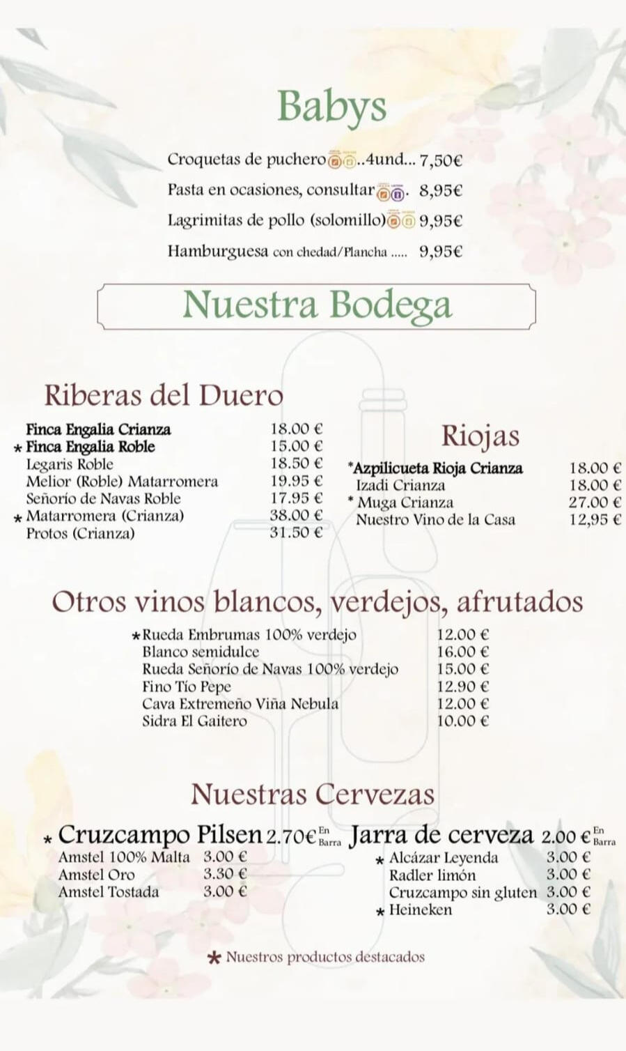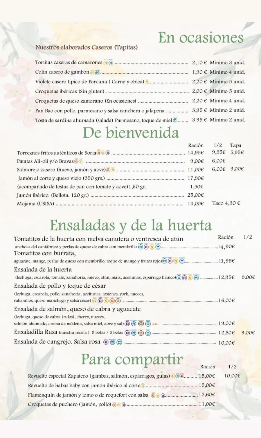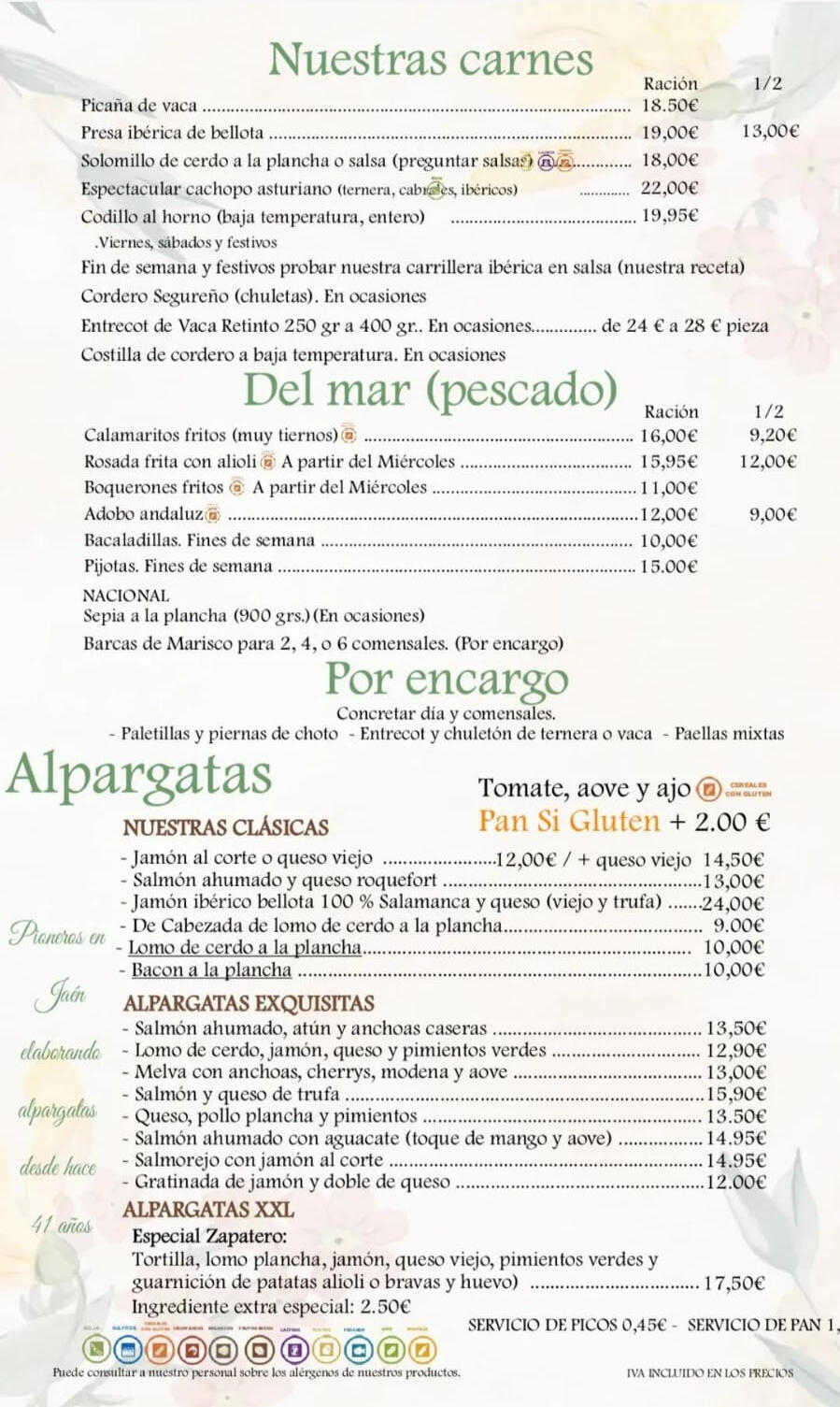 En nuestro restaurante, cada plato es una celebración de sabor y calidad. Nuestra selección de carnes está pensada para los paladares más exigentes: desde la jugosa picaña de vaca hasta la exquisita presa ibérica de bellota, pasando por el tierno solomillo de cerdo, los espectaculares cachopos asturianos y el suculento codillo al horno. Los fines de semana y festivos, no dejes de probar nuestras especialidades como la carrillera ibérica en salsa, el cordero segureño o la costilla de cordero a baja temperatura, auténticas joyas para los amantes de la carne.Si tu preferencia es el marisco y el pescado, nuestra propuesta es igual de tentadora: calamaritos fritos, rosada con alioli, boquerones fritos, adobo andaluz, bacaladillas o la ocasional sepia a la plancha. Para ocasiones especiales, ofrecemos barcas de marisco para compartir, listas por encargo para que la experiencia sea única.No podemos olvidar nuestras clásicas y alpargatas, elaboradas con mimo y combinaciones que van desde el jamón y queso viejo hasta el salmón ahumado con toques de trufa o aguacate. Para los que buscan un plato contundente y creativo, nuestras Alpargatas XXL, como el Especial Zapatero, son toda una experiencia culinaria acompañada de guarnición de patatas alioli, bravas y huevo.Para abrir el apetito, nuestras tapas y entrantes incluyen desde torreznos fritos auténticos de Soria, salmorejo casero y croquetas artesanas, hasta tostas innovadoras y pan Bao rellenos. Las ensaladas y platos de la huerta completan la carta, con combinaciones frescas, nutritivas y sorprendentes, ideales para compartir o disfrutar en solitario.Y para acompañar cada bocado, nuestra selección de vinos y cervezas ha sido cuidadosamente elegida: Riberas del Duero, Riojas, blancos afrutados y cavas, además de sidras y cervezas de diferentes estilos, para que cada comida sea un verdadero festín para los sentidos.Ven y descubre una carta pensada para saborear, compartir y recordar, donde cada plato es una experiencia que invita a repetir.
