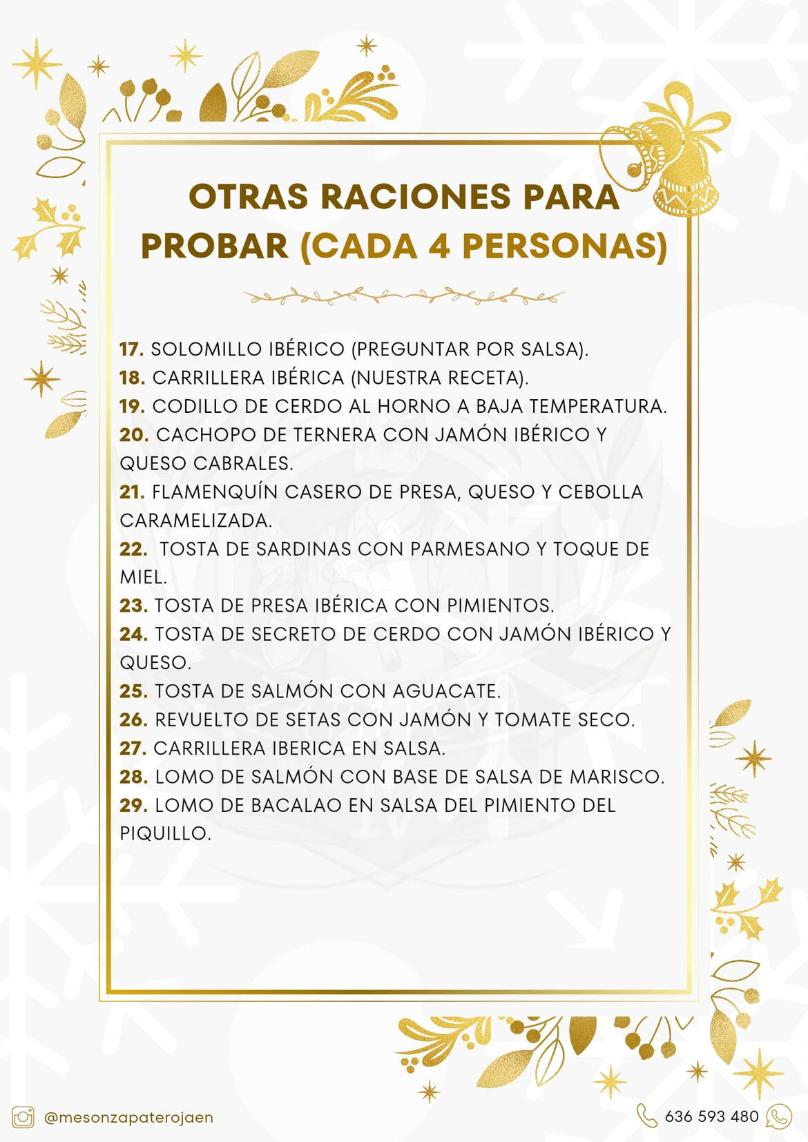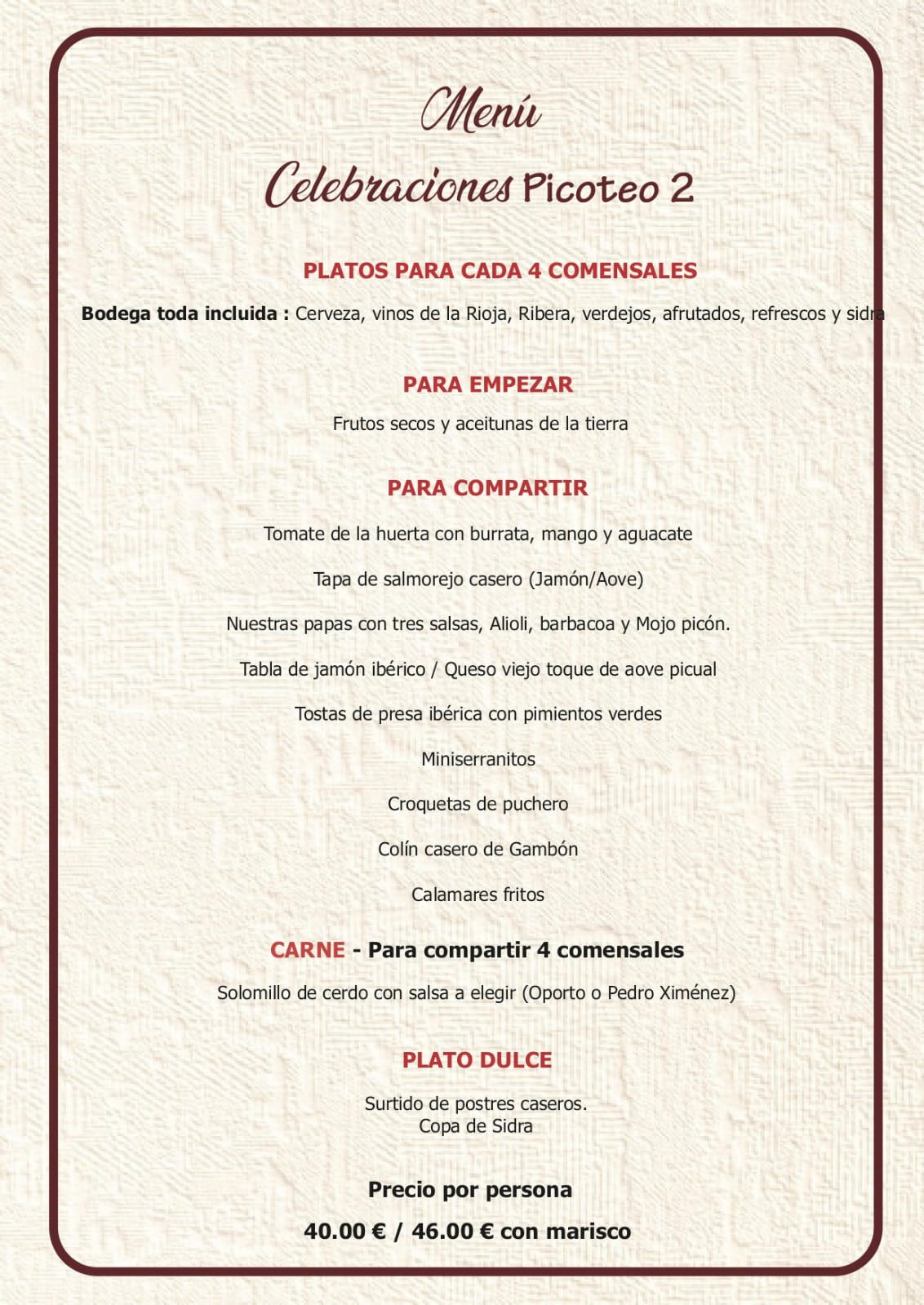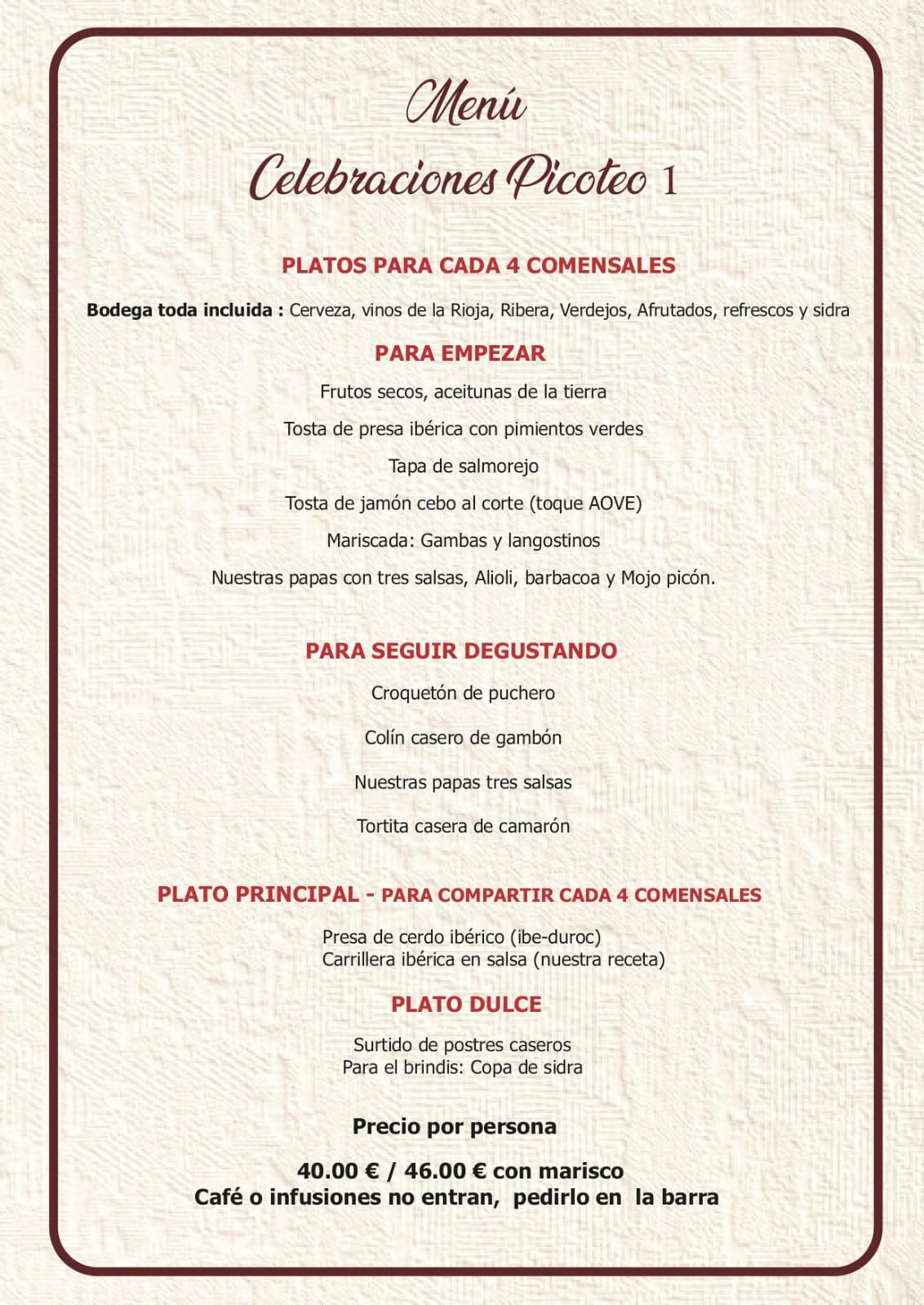En nuestro restaurante, cada plato es una celebración de sabor y calidad. Nuestra selección de carnes está pensada para los paladares más exigentes: desde la jugosa picaña de vaca hasta la exquisita presa ibérica de bellota, pasando por el tierno solomillo de cerdo, los espectaculares cachopos asturianos y el suculento codillo al horno. Los fines de semana y festivos, no dejes de probar nuestras especialidades como la carrillera ibérica en salsa, el cordero segureño o la costilla de cordero a baja temperatura, auténticas joyas para los amantes de la carne.Si tu preferencia es el marisco y el pescado, nuestra propuesta es igual de tentadora: calamaritos fritos, rosada con alioli, boquerones fritos, adobo andaluz, bacaladillas o la ocasional sepia a la plancha. Para ocasiones especiales, ofrecemos barcas de marisco para compartir, listas por encargo para que la experiencia sea única.No podemos olvidar nuestras clásicas y alpargatas, elaboradas con mimo y combinaciones que van desde el jamón y queso viejo hasta el salmón ahumado con toques de trufa o aguacate. Para los que buscan un plato contundente y creativo, nuestras Alpargatas XXL, como el Especial Zapatero, son toda una experiencia culinaria acompañada de guarnición de patatas alioli, bravas y huevo.Para abrir el apetito, nuestras tapas y entrantes incluyen desde torreznos fritos auténticos de Soria, salmorejo casero y croquetas artesanas, hasta tostas innovadoras y pan Bao rellenos. Las ensaladas y platos de la huerta completan la carta, con combinaciones frescas, nutritivas y sorprendentes, ideales para compartir o disfrutar en solitario.Y para acompañar cada bocado, nuestra selección de vinos y cervezas ha sido cuidadosamente elegida: Riberas del Duero, Riojas, blancos afrutados y cavas, además de sidras y cervezas de diferentes estilos, para que cada comida sea un verdadero festín para los sentidos.Ven y descubre una carta pensada para saborear, compartir y recordar, donde cada plato es una experiencia que invita a repetir.