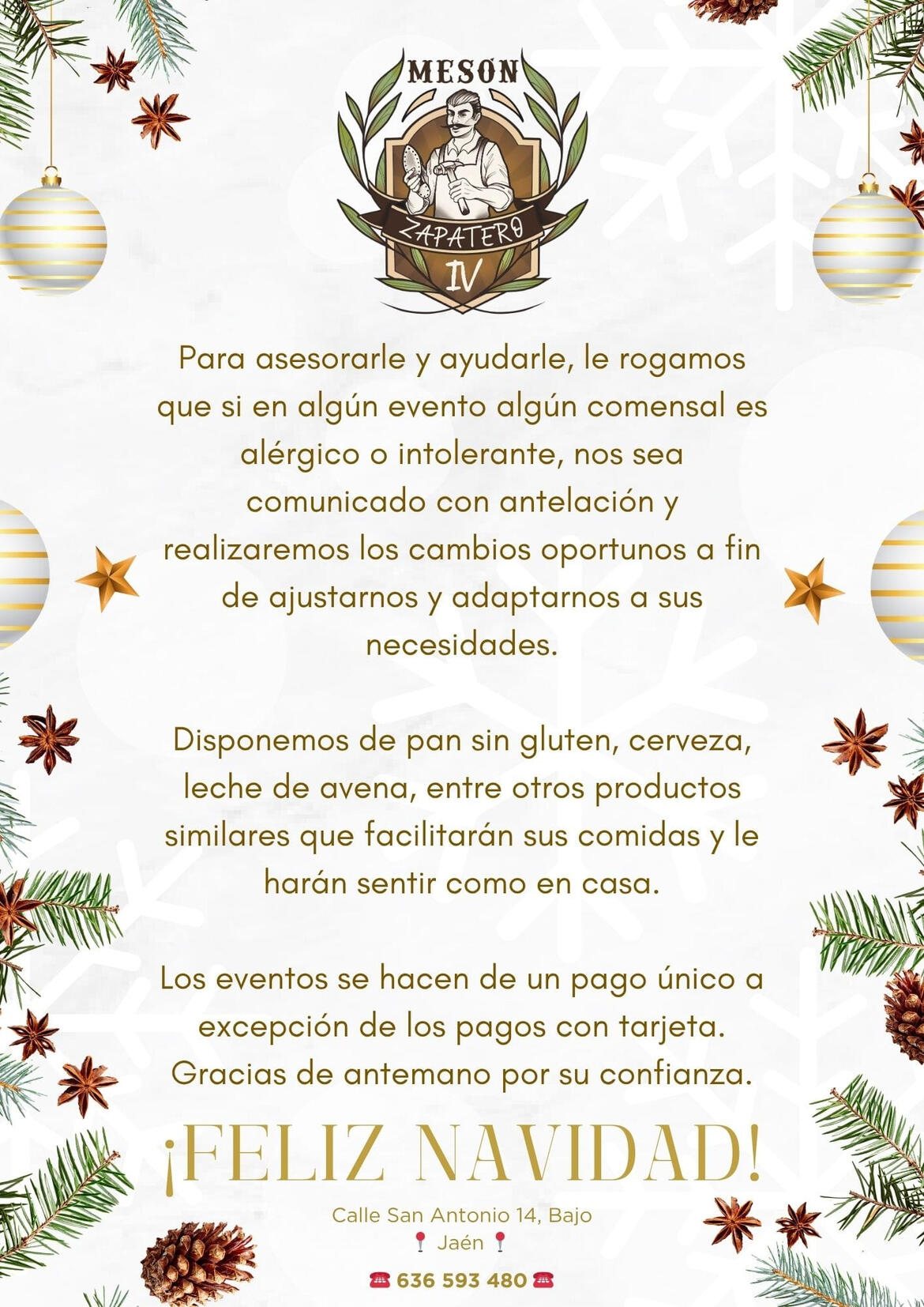 Para asesorarle y ayudarle, le rogamos que si en algún evento algún comensal es alérgico o intolerante, nos sea comunicado con antelación y realizaremos los cambios oportunos a fin de ajustarnos a sus necesidades.Disponemos de pan sin gluten, cerveza, leche de avena, entre otros productos similares que facilitarán sus comidas y le harán sentir como en casa.Gracias de antemano por su confianza.